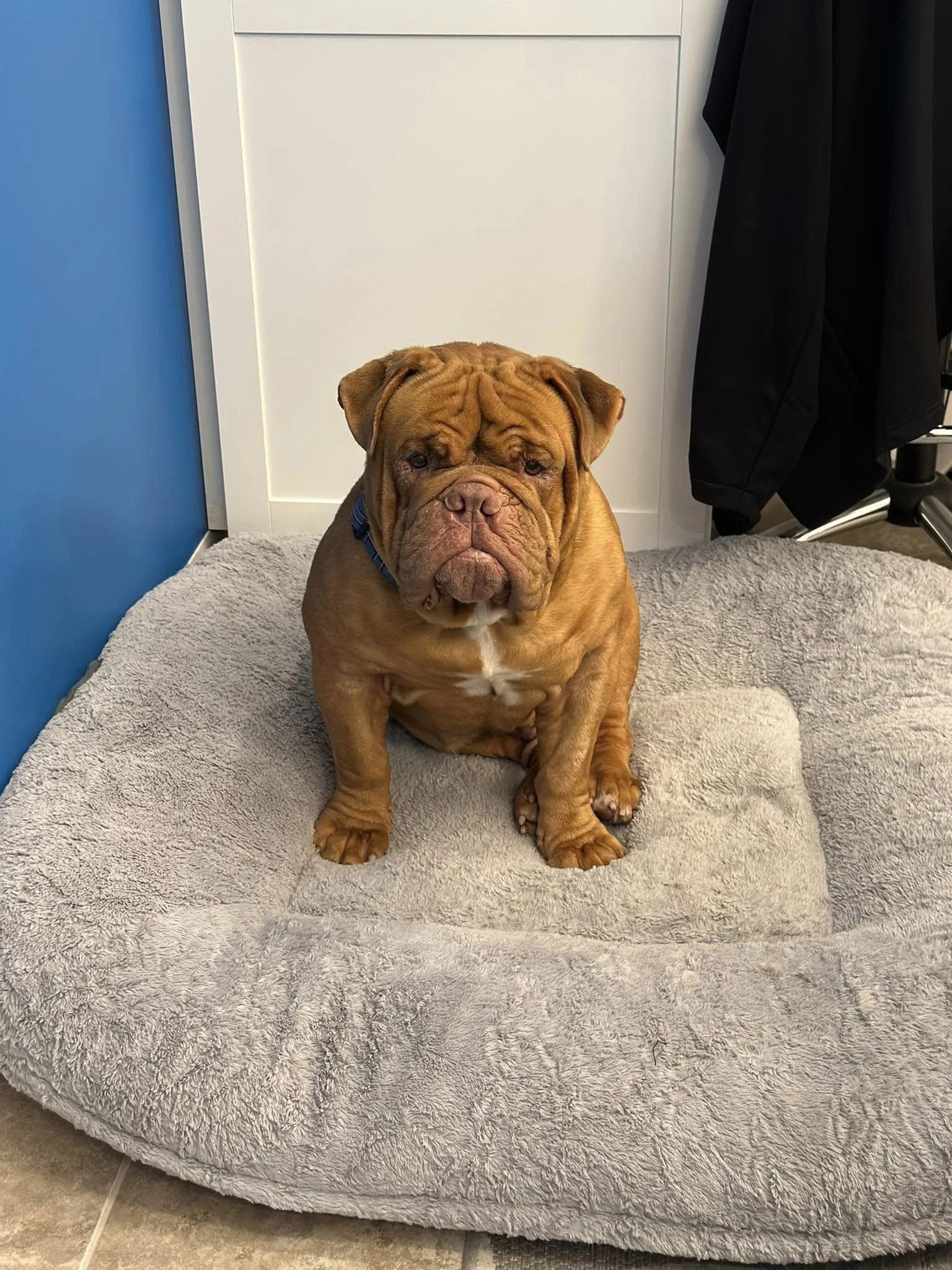 Originally labeled as a French Mastiff at the shelter, we later discovered through a DNA test that Gus is actually an Old English Bulldog. He was found as a stray with no microchip and no one searching for him. Given that he had to be fully potty trained, we suspect he may have come from a backyard breeding situation.